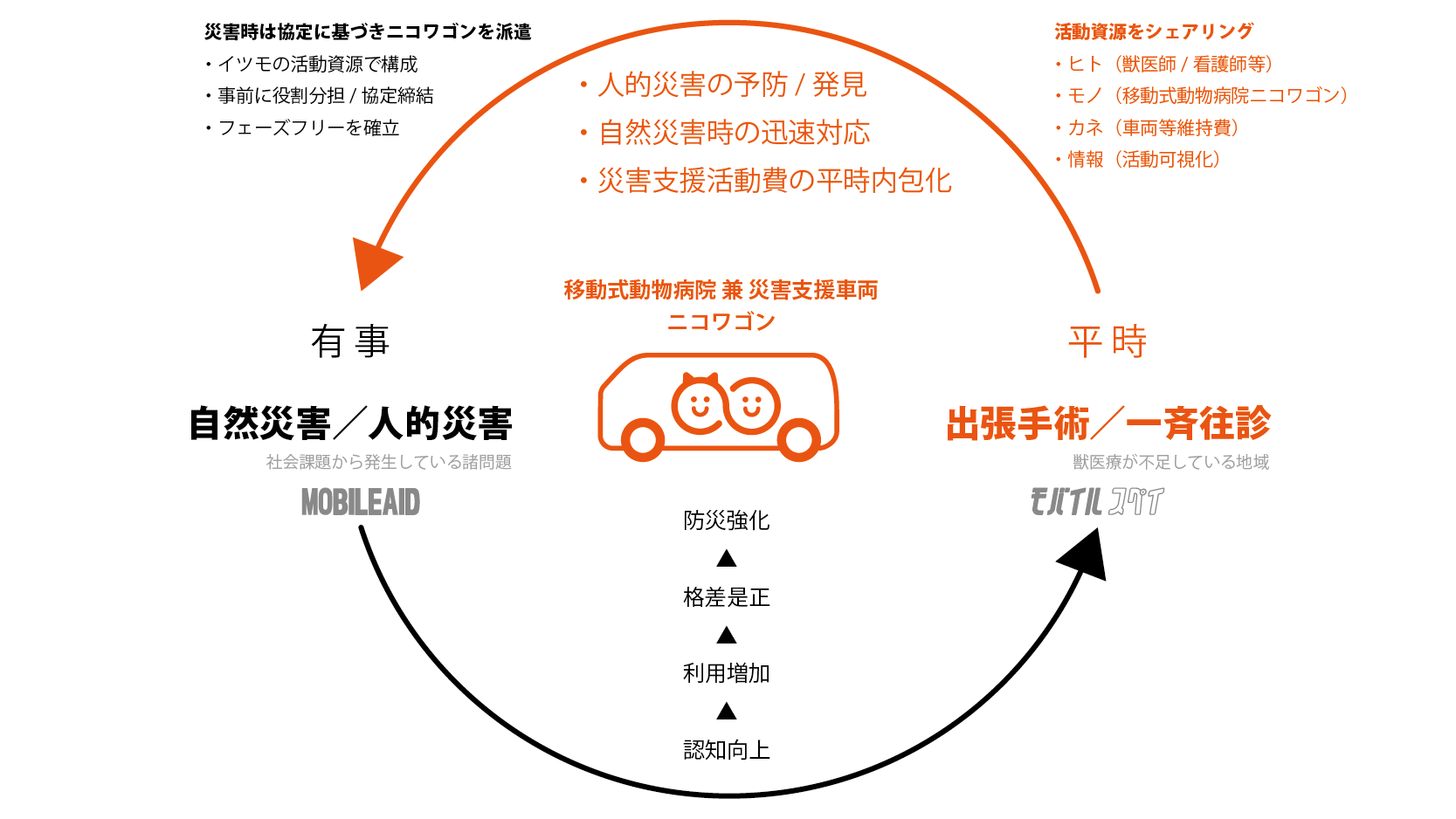 ニコワゴンは、平時から稼働することで、非常時にも機能する獣医療インフラを実現しています。